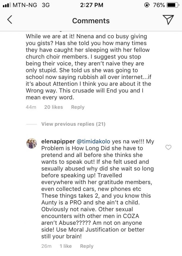 The user tells Timi to stop defending the women or ‘victims’ and instead, check his home first. This follower is trying to imply that Busola Dakolo has had one or more children for a pastor, and not for the artiste.