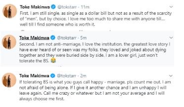 Toke this morning via her twitter handle, technically denied the reports. According to her, she is ”as single as a dollar bill”, and her singleness is not as a result of scarcity of men but by choice.